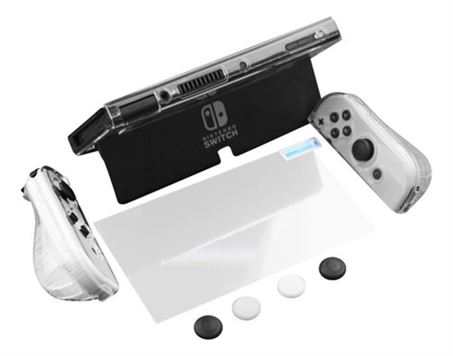 -1 Vidrio Templado para Nintendo Switch OLED-1 Carcasa acrilica para Nintendo Switch OLED-2 Carcasas para Joycons-4 Caps de silicona