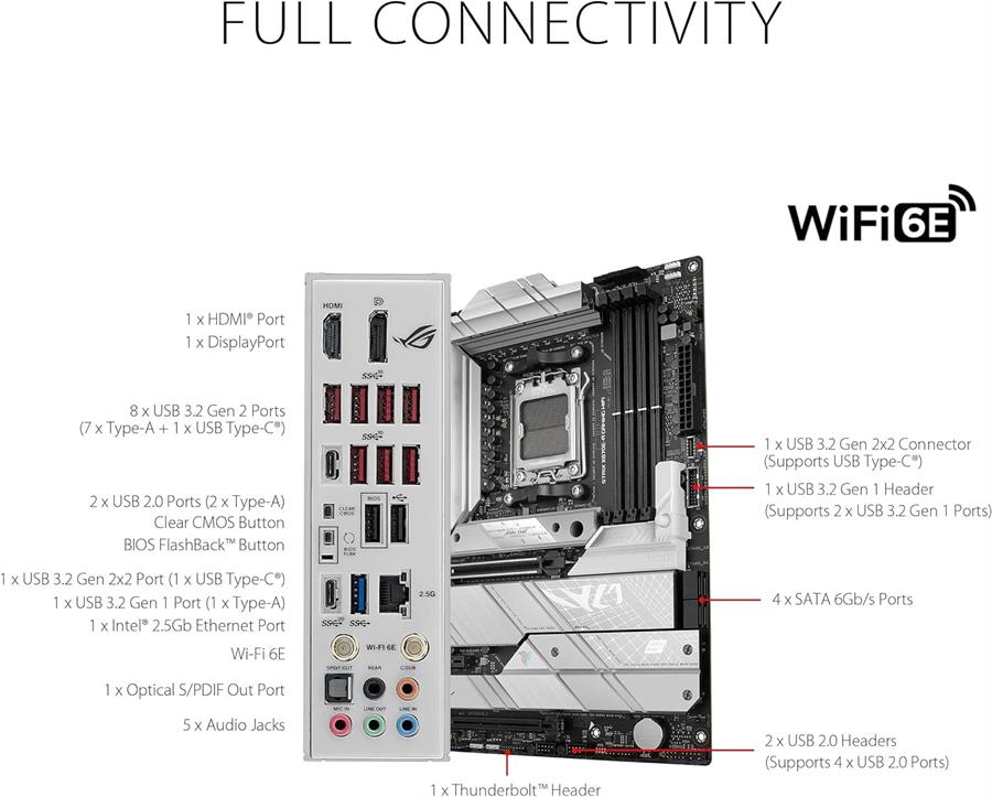 - Red de alto rendimiento: WiFi 6E integrado, Ethernet Intel® de 2,5 Gb y ASUS LANGuard.